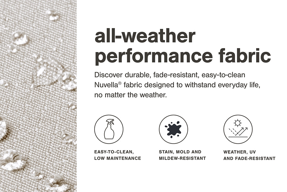 Details | Includes 7 modular pieces: 5 outdoor lounge chairs and 2 outdoor end tables, Chair frame and table made with aluminum, Solution-dyed high-performance fabric, Nuvella® is an outdoor fabric that can be cleaned and offers UV resistance, Stainless steel hardware, Designed to withstand the harsh elements of the outdoors, Cushioned seat, Back cushion included, Includes PVC protective weather cover, Clean fabric with mild soap and water, let air dry; for stubborn stains, use a solution of 1 cup bleach to 1 gallon water, Assembly required | |