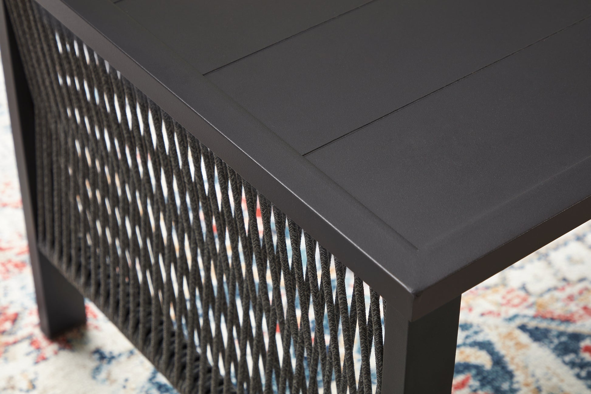 Details | Includes loveseat, 2 lounge chairs and coffee table, Rust-resistant aluminum frame with durable powder coated finish, Powder coated aluminum resists rusting and fading, Polyester rope, Foam cushion core wrapped in soft polyester for a low-maintenance, comfortable cushion, Solution-dyed high-performance fabric, Nuvella® is an outdoor fabric that can be cleaned and offers enhanced UV resistance, Clean fabric with mild soap and water, let air dry; for stubborn stains, use a solution of 4 oz. bleach to 28 oz. water, Stainless steel hardware resists rust and boosts longevity, Designed to withstand the harsh elements of the outdoors, 2 throw pillows included, Assembly required | |