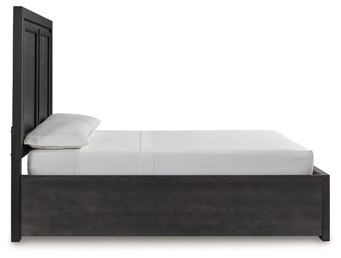 Details | Includes queen panel headboard, storage footboard, and rails with roll slats, Made with hardwood solids, select oak veneers and engineered wood, Two-tone finish (brushed black and dusty grayish brown wood tone), Headboard with picture frame moulding, Footboard with two deep drawers, Smooth-gliding soft-close drawers with fully finished interiors and dovetail construction, Sleek drawer pulls with black finish, Bed does not require additional foundation/box spring; accommodates most zero clearance adjustable bases with the addition of a bunkie board, Mattress available, sold separately, Assembly required | |
