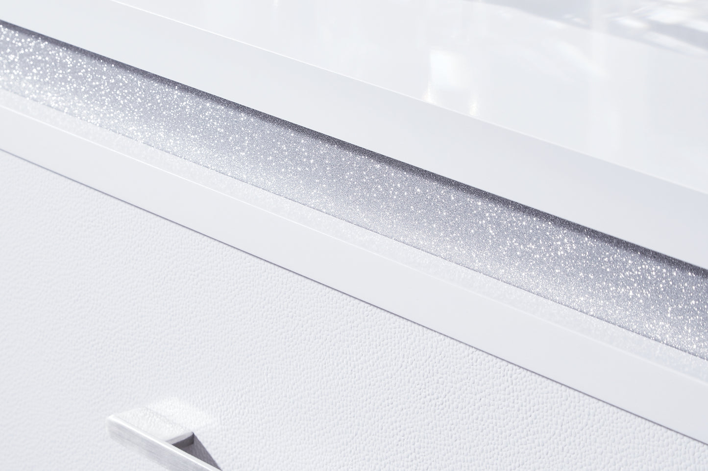 Details | Made with hardwood solids and MDF substrates, White paint finish, Inset acrylic glitter accents, Horizontal metal drawer pulls, 4 drawers with fully finished interiors, dovetail construction and heavy-duty ball-bearing side glides, Textured drawer fronts | |