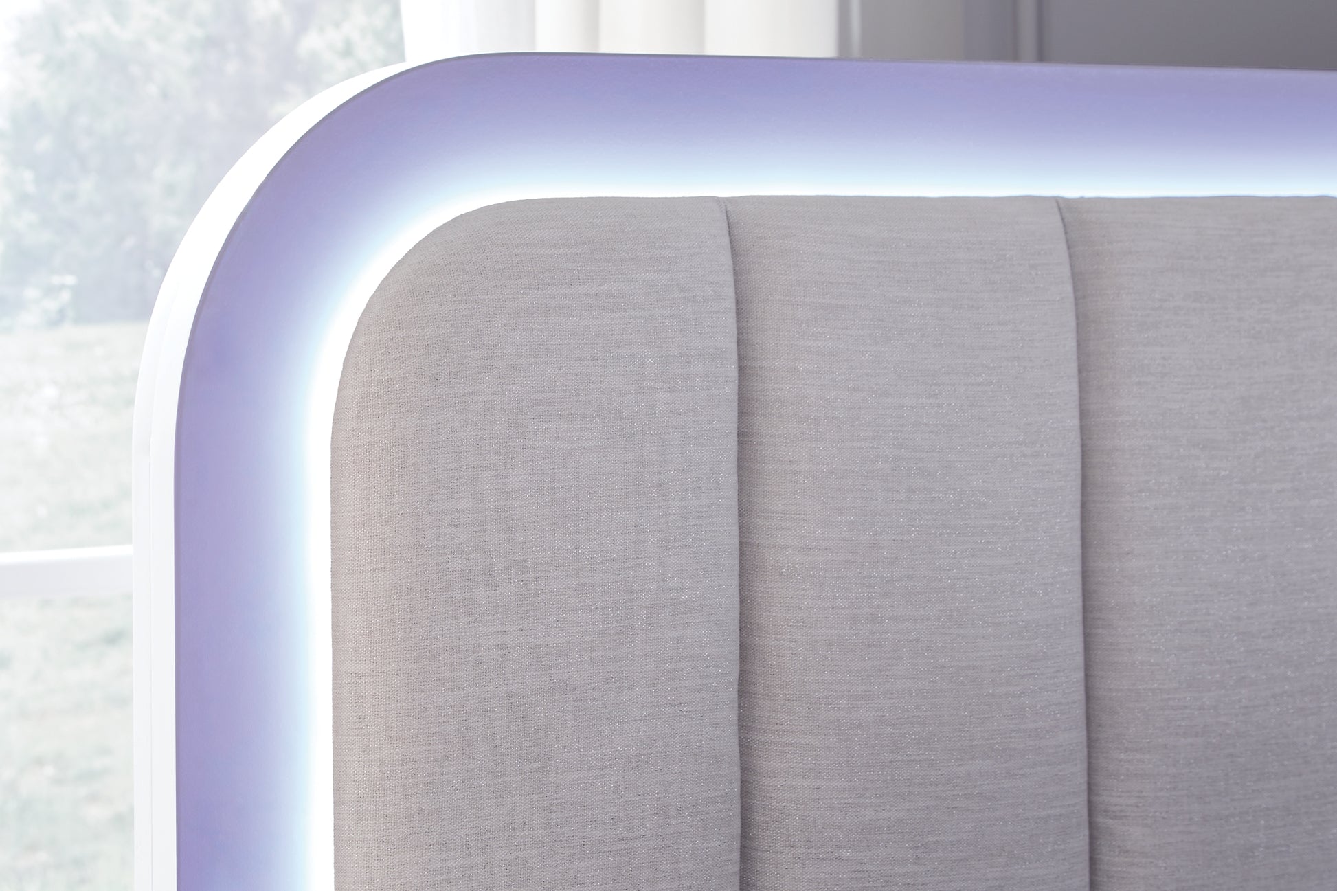 This queen upholstered panel bed is a showstopper, bringing a touch of modern glamour to your sanctuary. A sleek white finish, paired with the cushioned headboard’s off-white fabric and metallic silver accent threads, creates a sophisticated feel. Built-in LED lighting adds a soft glow, making it even easier to get ready in the morning or wind down at night. It’s a simply stunning way to achieve the bedroom of your dreams.