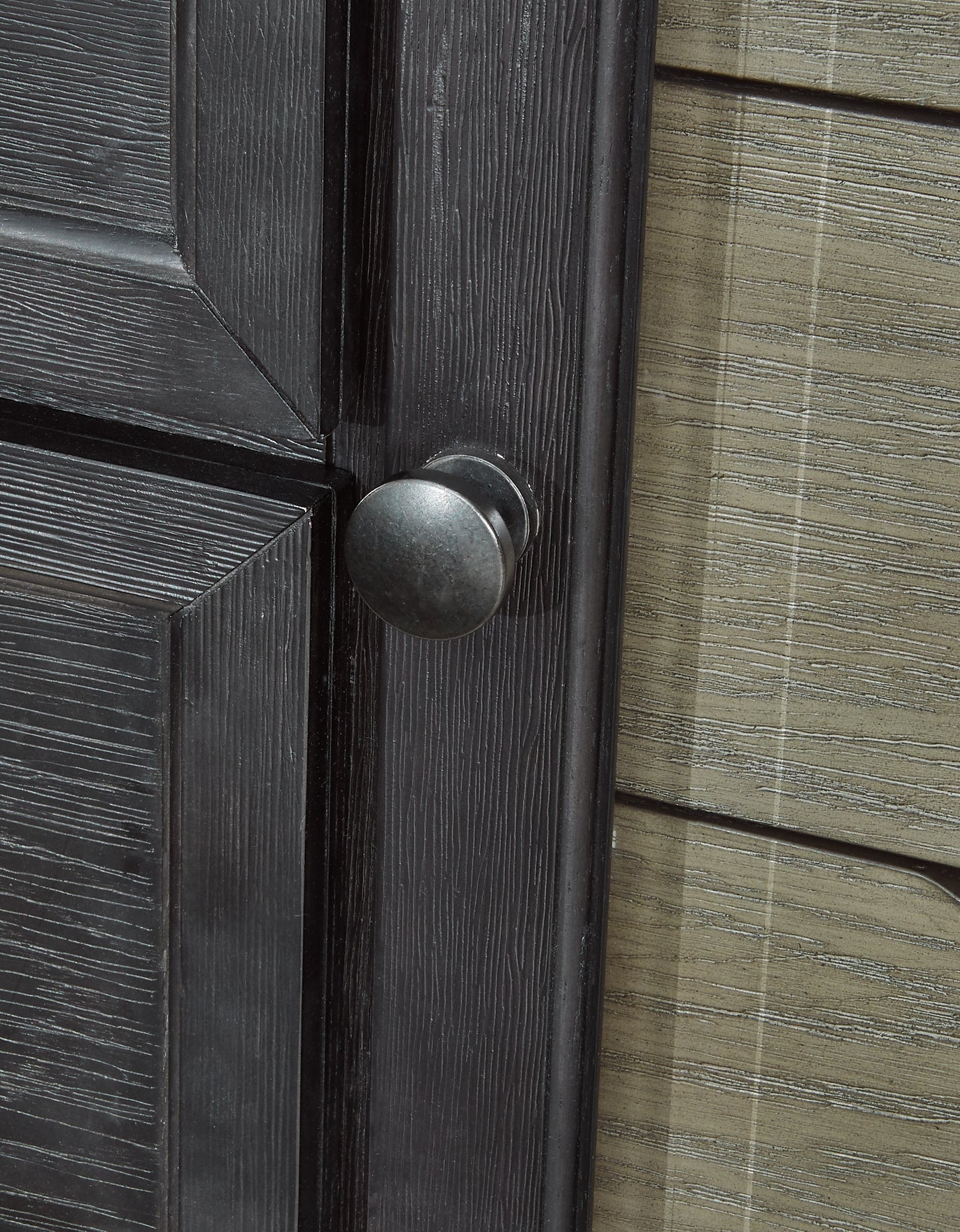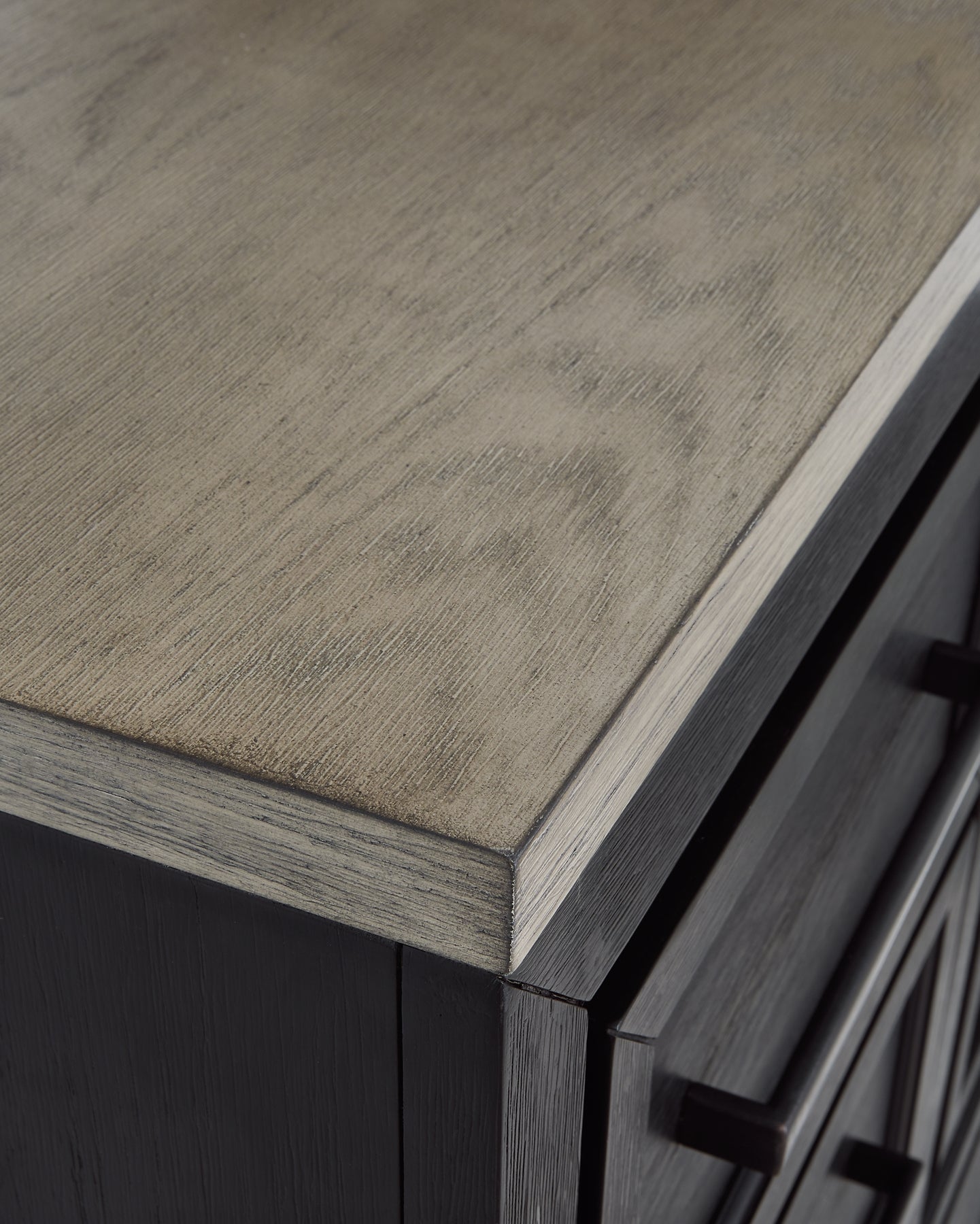 Details | B989B4: Includes king panel headboard, storage footboard and rails with roll slats, Made with hardwood solids, select oak veneers and engineered wood, Two-tone finish (brushed black and dusty grayish brown wood tone), Headboard with picture frame moulding, Footboard with two deep drawers, Smooth-gliding soft-close drawers with fully finished interiors and dovetail construction, Sleek drawer pulls with black finish, Bed does not require additional foundation/box spring; accommodates most zero clearance adjustable bases with the addition of a bunkie board, Mattress available, sold separately, Assembly required, B989B1: Includes dresser and mirror, Made with hardwood solids, select oak veneers and engineered wood, Two-tone finish (brushed black and dusty grayish brown wood tone), Sleek drawer pulls with black finish, 11 soft-close, smooth-gliding drawers with fully finished interiors and dovetail construction (top drawers felt lined), 5 drawers with brushed black finish; 6 drawers with grayish brown wood tone, 3 drawers located behind each door, Mirror mounts to back of dresser, Assembly required, B989-48: Made with hardwood solids, select oak veneers and engineered wood, Two-tone finish (brushed black and dusty grayish brown wood tone), Sleek drawer pulls with black finish, 5 soft-close, smooth-gliding drawers with fully finished interiors and dovetail construction (top drawers felt lined), 3 pull-out trays (felt lined) and 2 adjustable shelves behind door, B989-92: Made with hardwood solids, select oak veneers and engineered wood, Two-tone finish (brushed black and dusty grayish brown wood tone), Sleek drawer pulls with black finish, 2 soft-close, smooth-gliding drawers with fully finished interiors and dovetail construction, 110V power supply with dual USB charging port, Power cord included; UL listed, | |